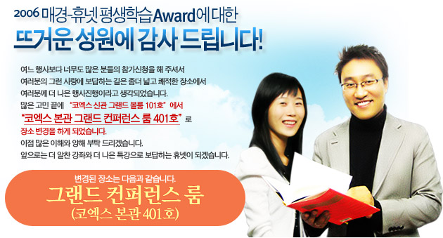 ±ÛÁ¦¸ñ 2006 Æò»ýÇнÀ Award Àå¼Ò°¡ º¯°æµÇ¾ú½À´Ï´Ù.